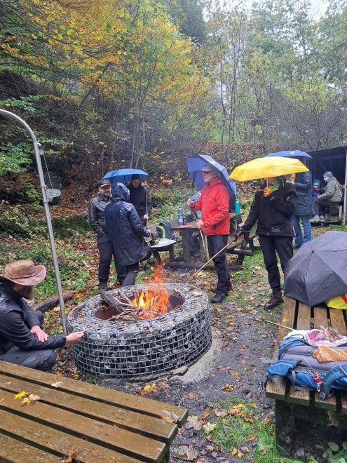 „Da zeigt doch gar kein Wegzeichen hin!“ – „da ist aber ein Weg!“. Wie bei so einigen unserer Wanderungen folgten wir auch jetzt diesem Motto. Also gings den Wald hoch, wir streiften das Landgut Uhenfels, mitten im Wald die Grabstätte von Georg Warburg und erreichten schließlich unsere Grillstelle. Trockenes Holz zu finden war kein leichtes Unterfangen, dennoch gelang es uns (dank der fleißigen Holzsammlerin Claudia), ein wärmendes Feuer zu entfachen. Das Wetter kippte vollends, und wir mussten im Regen grillen.