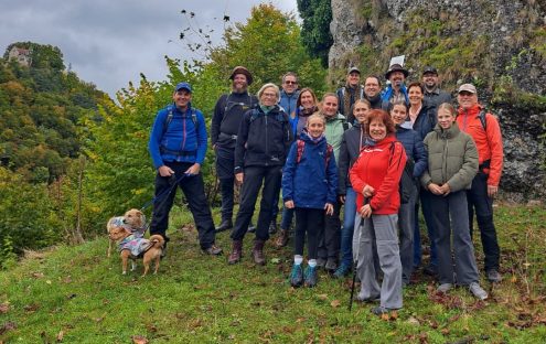 Am Wanderparkplatz Rietheimer Bahnhöfle oberhalb Seeburgs startete unsere Wanderung um 10.30 Uhr – eine ideale Uhrzeit für alle, die ein bisschen länger schlafen wollen. Zu Beginn durften wir die Aussicht ins Seeburger Tal und ein wenig später auf das Schloss Uhenfels genießen. Hin und wieder regnete es ein bisschen, was unserer Stimmung aber keinen Abbruch tat. Nach dem Aufstieg zum Gefallenendenkmal von 1919, gestiftet von Georg Warburg, Besitzer des Schloss Uhenfels, wanderten wir durch die Trailfinger Schlucht bis zur Quelle der Erms, die uns ein bisschen an einen kleinen Blautopf erinnerte.