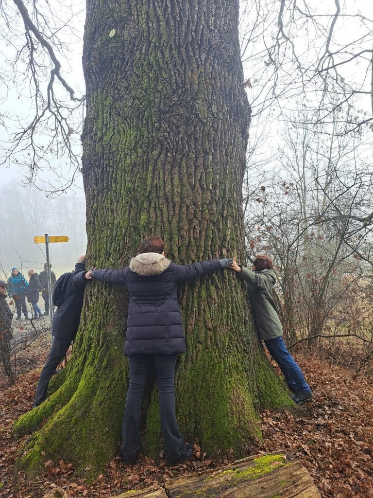 Im dichten Nebel starteten wir vom Parkplatz Bürgerseen um einen der drei zugefrorenen Seen zum Herrenhäusle. Dieses ließ Herzog Carl Eugen von Württemberg für seine Jagdgesellschaften mit Stall und Jagdstube bauen. Wir stapften durch den Wald Richtung Dettingen, bis wir am Naturdenkmal Mannsbergsee ankamen. Die Eisvögel suchten wir vergeblich, entweder waren wir zu laut oder den Vögeln war es zu kalt. Dann gings auf Wiesen weiter zum Hirschsprung, weder die Einheimischen („die einen sagen so, die andern sagen so“) noch wir wissen nicht, was für eine Sage denn dahinter steht. Nun denn, es bleibt ein kleines Geheimnis. Dann kamen wir bei der zirka 500 Jahre alten Schindereiche an, die zwar lediglich 30m hoch ist, aber einen stattlichen Umfang von 6 Metern hat. Das musste uns natürlich nochmal überprüft werden.