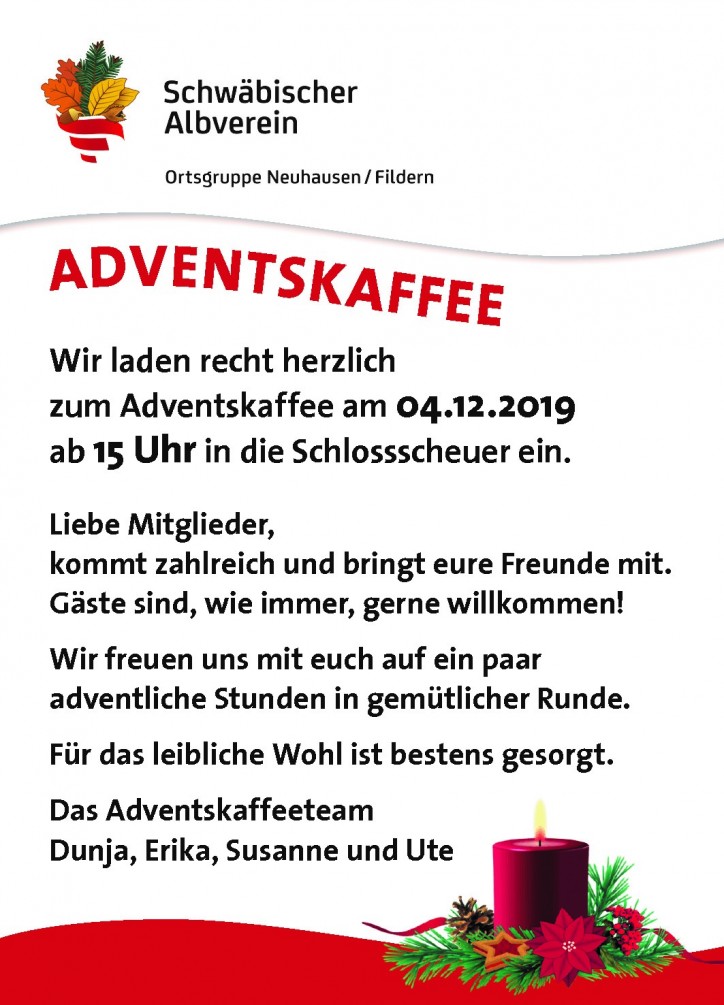Adventskaffee Ortsgruppe Neuhausen/Fildern Mi., 04.12.2019, Neuhausen Uhrzeit: 15:00 - 22:00 Ort: Vereinsheim Schloss-Scheuer Klosterstr. 3 73765 Neuhausen iCalendar Mit dem Laden der Karte akzeptieren Sie die Datenschutzerklärung von Google.Mehr erfahren Karte laden Google Maps immer entsperren zur Übersicht