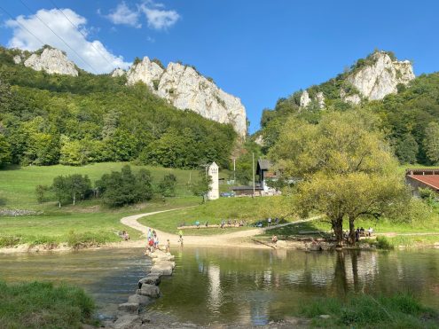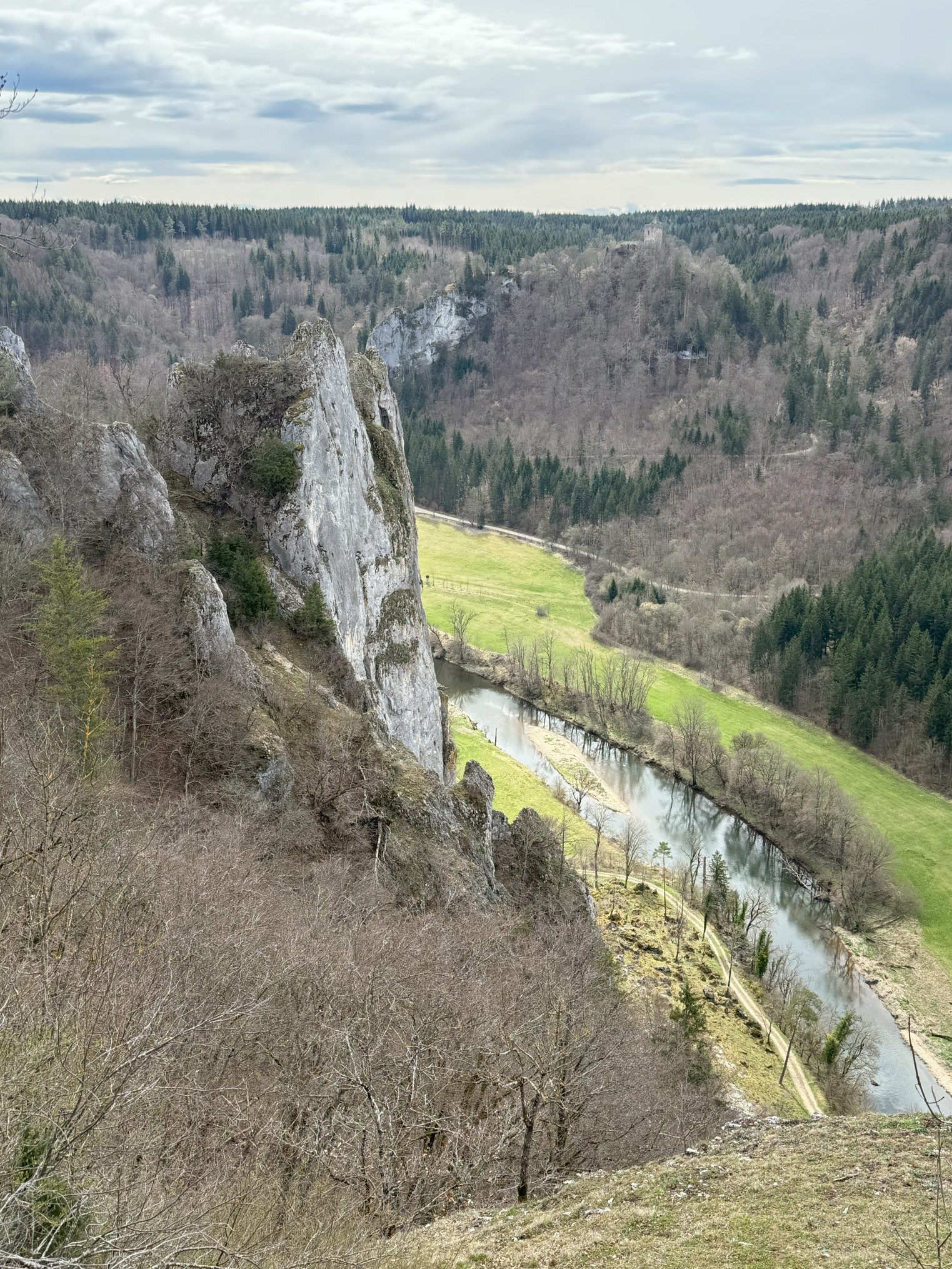 Fast 850 Höhenmeter Auf- und Abstieg – nein, es geht nicht in die Alpen. Das geht auch auf der Schwäbischen Alb! Wir sind am Sonntag, 28. April 2024 im Oberen Donautal unterwegs, das auch „Schwäbischer Grand Canyon“ genannt wird: Imposante Felsen mit tollen Aussichten, eine Burgruine, Höhlen, Bergwald und natürlich die junge Donau sorgen auf den gut 18 km (reine Gehzeit: 6,5 Stunden) für eine abwechslungsreiche Tour. Für die überwiegend schmalen, teils sehr steilen und auch unwegsamen Pfade ist Trittsicherheit, Schwindelfreiheit und gute Kondition gefordert. Dafür werden wir mit wunderschönen Ausblicken belohnt. Zur Halbzeit machen wir ein Rucksackvesper und kurz vor Ende der Tour können wir einkehren, bevor es abenteuerlich auf großen Trittsteinen über die Donau und den letzten Anstieg zum Startpunkt, dem Wanderparkplatz am Knopfmacherfelsen, zurück geht.
