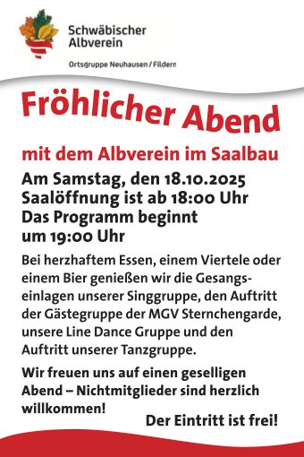 Fröhlicher Abend Ortsgruppe Neuhausen/F. Sa., 18.10.2025, Uhrzeit: 18:00 - 22:30 iCalendar Mit dem Laden der Karte akzeptieren Sie die Datenschutzerklärung von Google.Mehr erfahren Karte laden Google Maps immer entsperren zur Übersicht