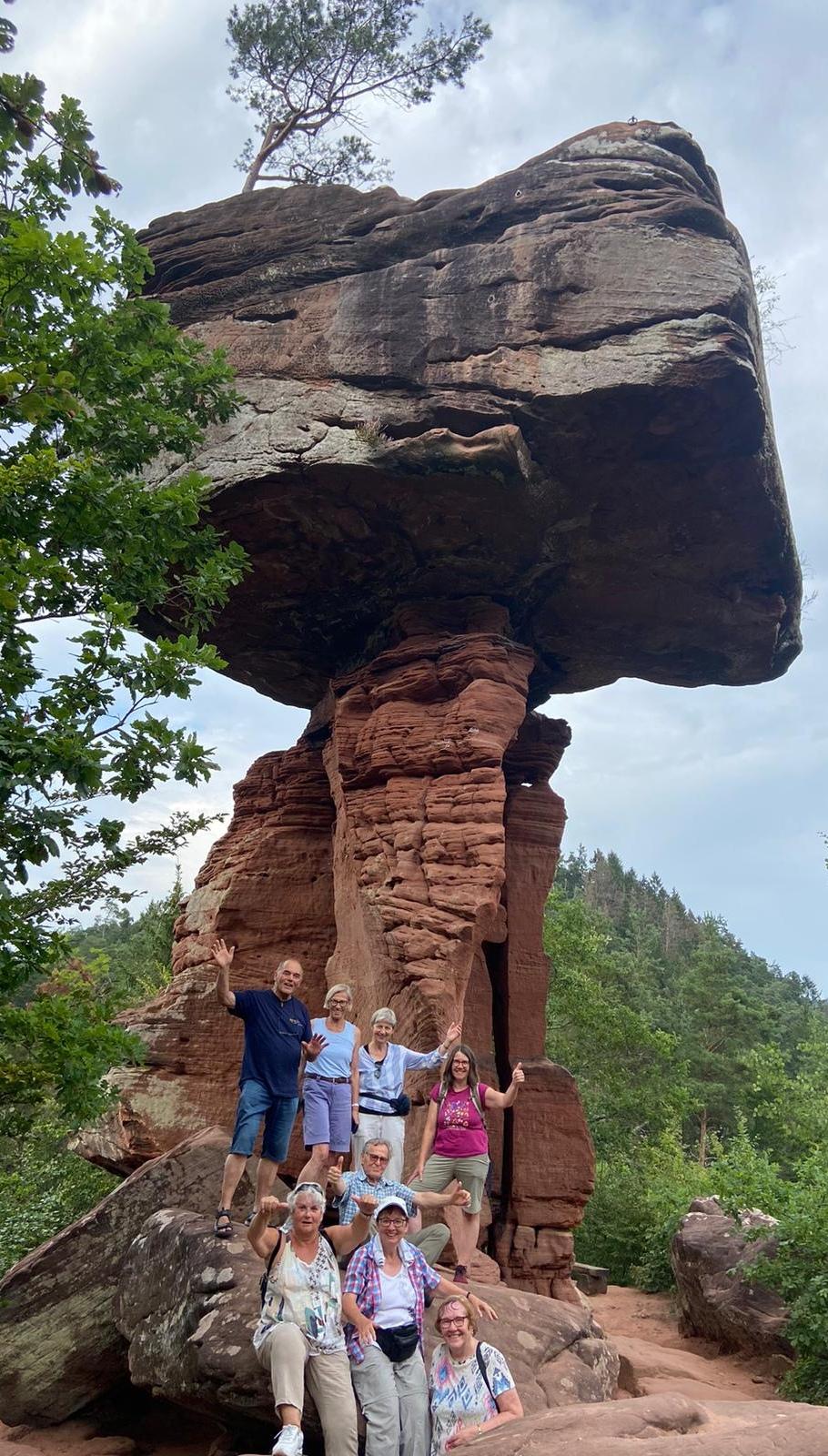Am letzten Samstag, 19. August machte sich ein voller Bus mit 44 Teilnehmern auf den Weg nach Bad Bergzabern, Dahn und Hinterweidenthal in den Pfälzer Wald. Eine „heiße“ Sache, aber doch besser zu ertragen als befürchtet. In 2 Gruppen gab es eine große und kleine Stadtführung im historischen Ortskern von Bad Bergzabern. Wir hörten von bedeutenden Adelsgeschlechtern, Kirchen, dicken Stadtmauern und Generationen von Winzern. Das Mittagessen – in einer großen Hütte mit festen Gebäuden und Freiflächen mit Schatten – hatte es in sich. Zügig, vielseitig, interessant und perfekt organisiert. Oft drehten sich Gespräche um Pfälzer Gastfreundschaft, den „Saumagen“ und es entstanden viele neue oder tiefere Kontakte! Nach dem Essen startete eine ausgedehnte und etwas später eine kurze Wanderung im Felsenland bei Dahn. Zwei örtliche Wanderführer führten und informierten uns rund um die Felsen und Wälder. Wer es an diesem heißen Tag bei nur 333 Schritten belassen wollte, hat sich eine schöne Zeit im Biergarten des Wanderheims Im Schneiderfeld gemacht! Ein reger Austausch war sichergestellt! Wir waren von den Eindrücken in der Felsenlandschaft begeistert. Es kam die Frage auf, wie konnten solche Monumente nur entstehen?