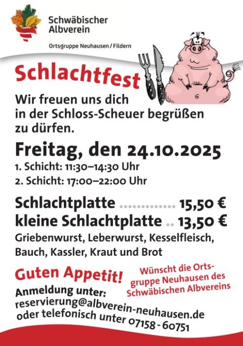 Schlachtfest 2025 Ortsgruppe Neuhausen/F. Fr., 24.10.2025, Uhrzeit: 11:30 - 22:00 iCalendar Mit dem Laden der Karte akzeptieren Sie die Datenschutzerklärung von Google.Mehr erfahren Karte laden Google Maps immer entsperren zur Übersicht