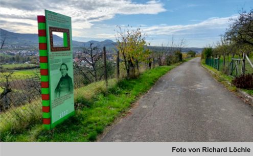 Zurück geht es durch die Weinberge mit toller Aussicht auf Metzingen. Hier können wir den Blick von Mörike durch einen am Wegrand aufgestellten Bilderrahmen nachvollziehen.