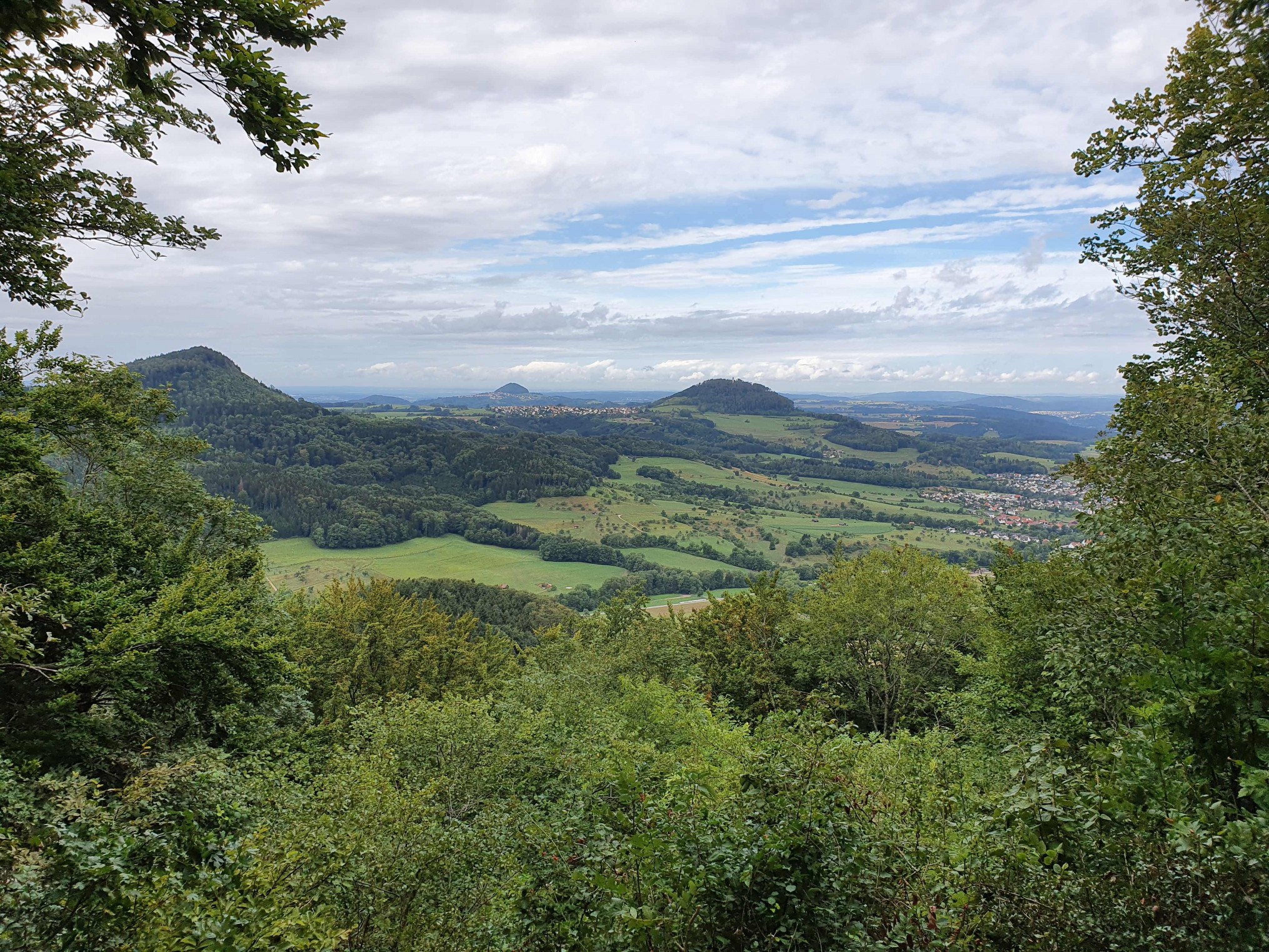 Wir gehen Teile auf dem „Weg der Besinnung“ hinauf auf den Bernhardus und haben auf dem Halbhöhenweg schöne Ausblicke auf das Degenfelder Tal.